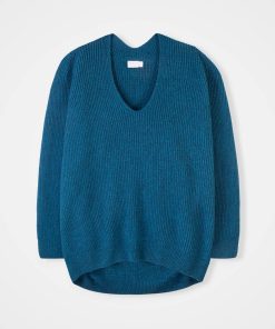 This V neckline jumper features a cocoon shape that gently drapes at the back. The half cardigan stitch rib adds texture, creating a piece that combines comfort with a timeless design, perfect for everyday wear.