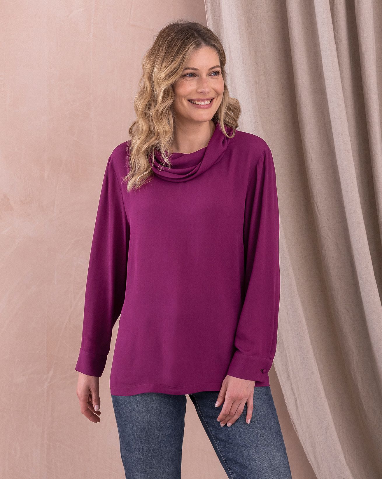 Our woven blouse has a high, double layered cowl neckline which is modest and cosy. Long sleeves end in shirt cuffs fastened with natural Corozo buttons and we’ve added splits in the side seam for ease of fit. A great staple piece for your winter wardrobe, it looks great worn with trousers or skirts and can be dressed up or down with ease.
