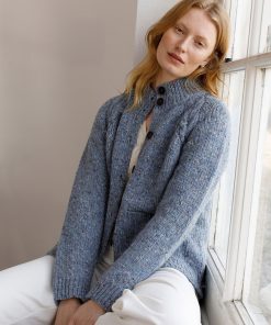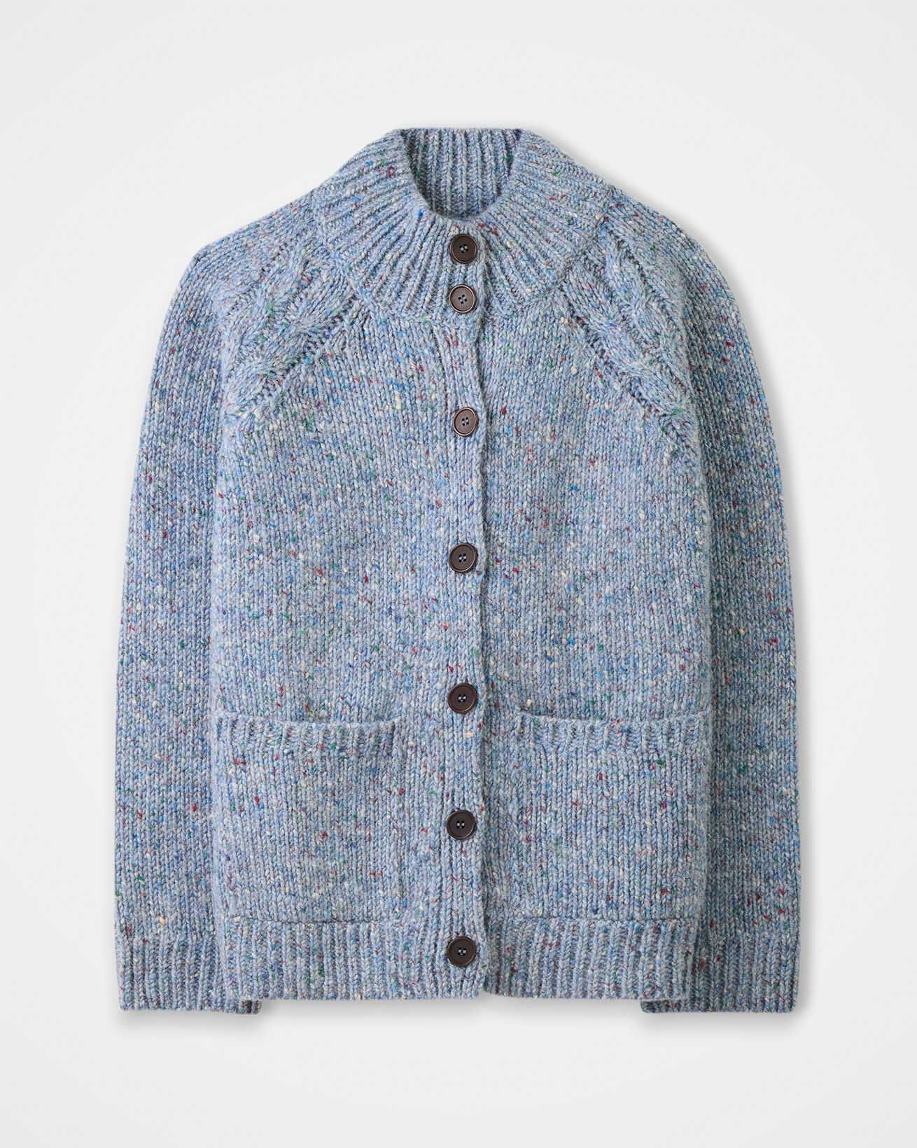 Perfect for wrapping up against cold winds, this warm funnel neck cardigan is crafted in a chunky weight Donegal yarn with patch pockets and ribbed cuffs, collar and hem. Details include cabling down the Raglan sleeve seam and Corozo buttons running down the front to fasten.