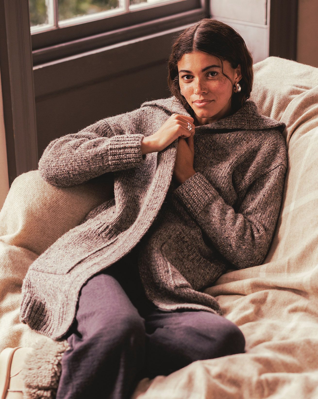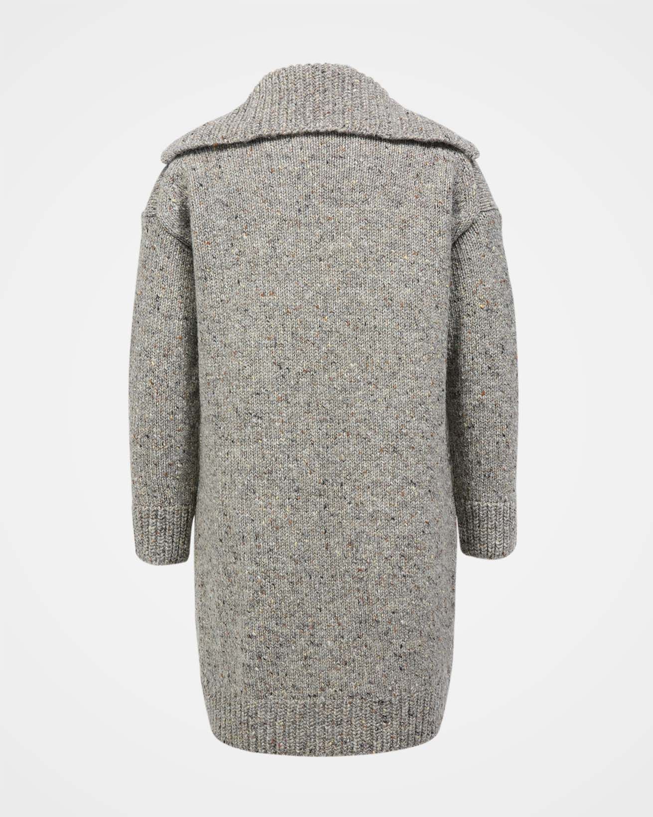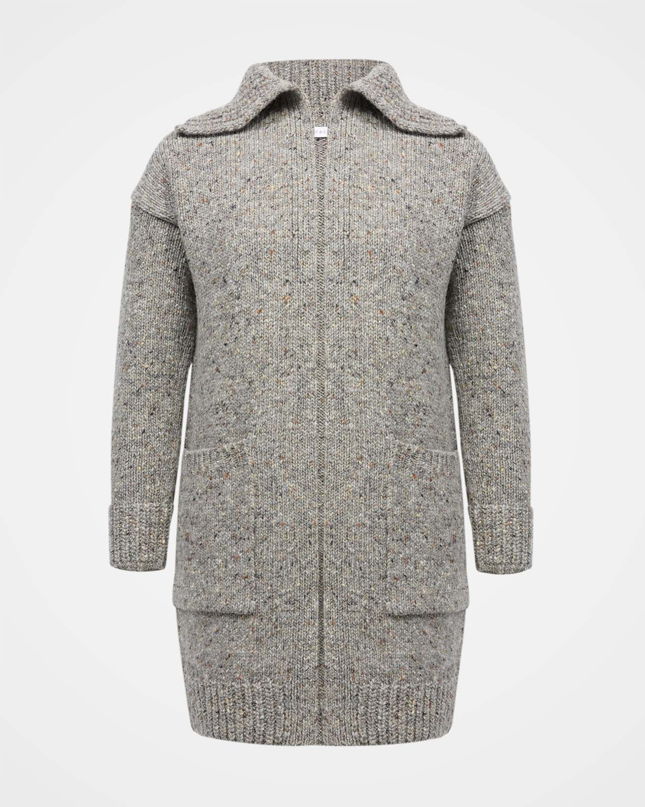 The Donegal longline coatigan is the perfect mix between a coat and a cardigan, thanks to the chunkier weight Donegal yarn that it is knitted from. With its statement shawl collar, edge to edge styling and longer length you can wear it both outside and in, depending on what the Great British weather throws your way. Details include patch pockets and a ribbed collar and cuffs.