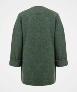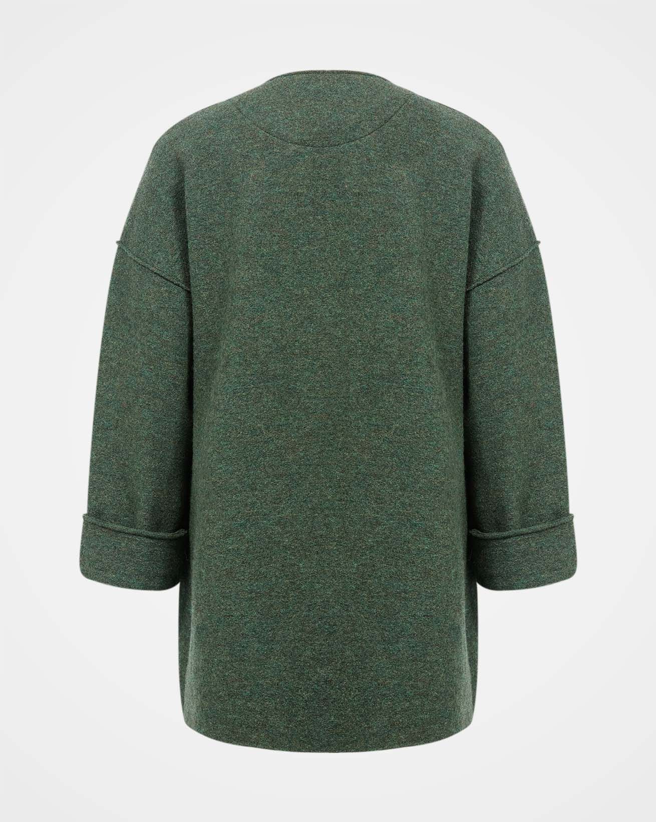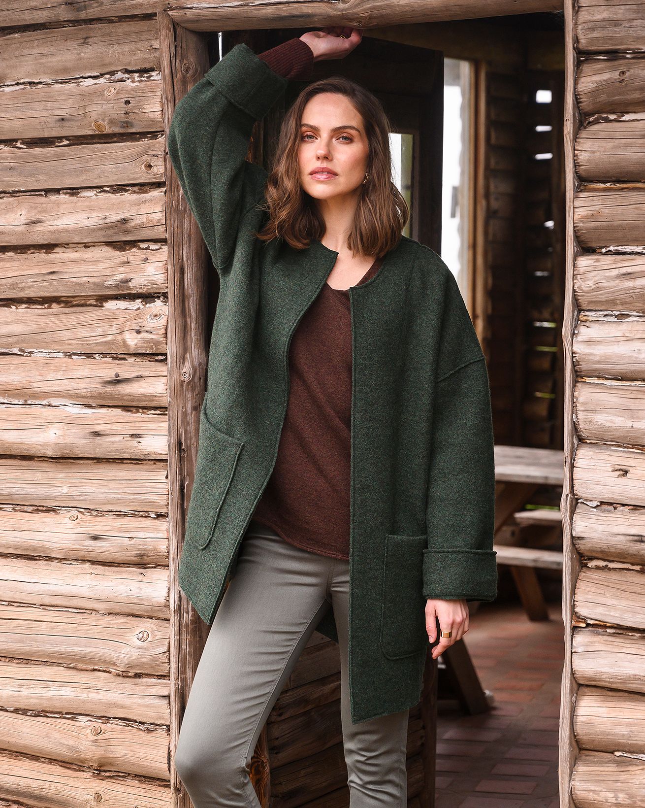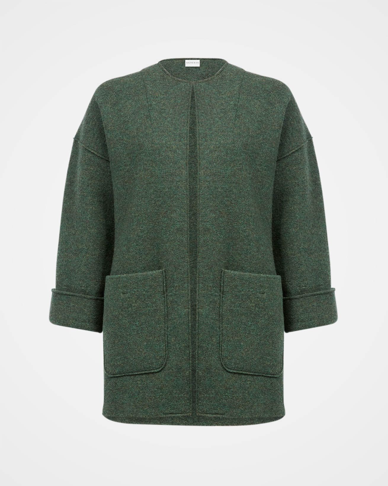 Crafted from a boiled wool fabric, this collarless coatigan features a drop shoulder boxy fit and edge-to-edge styling for a contemporary look. It offers warmth and sophistication, perfect for layering in cooler weather.