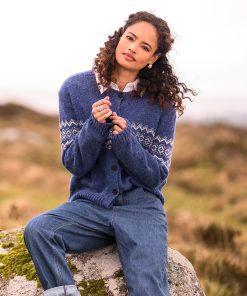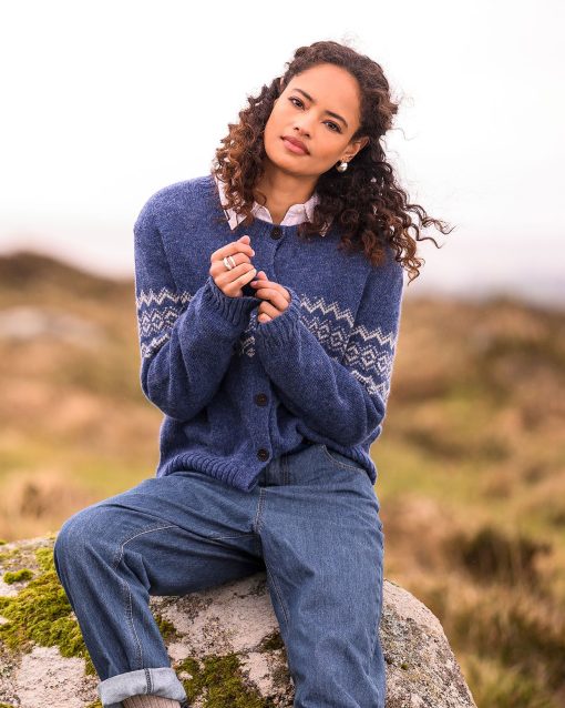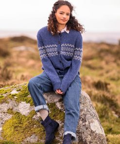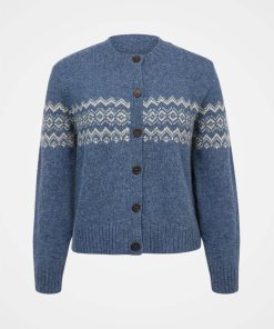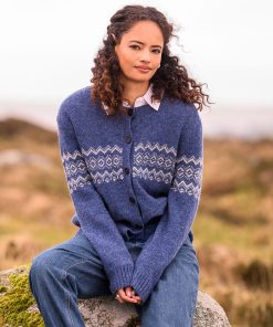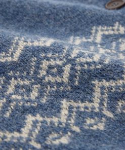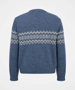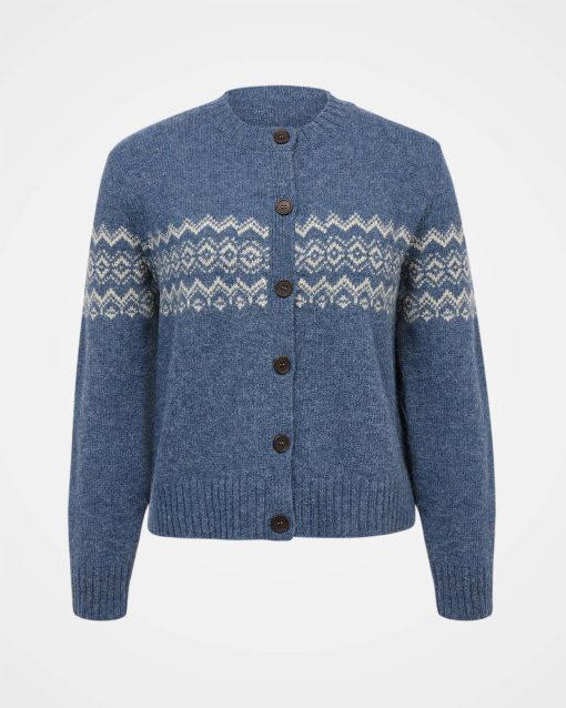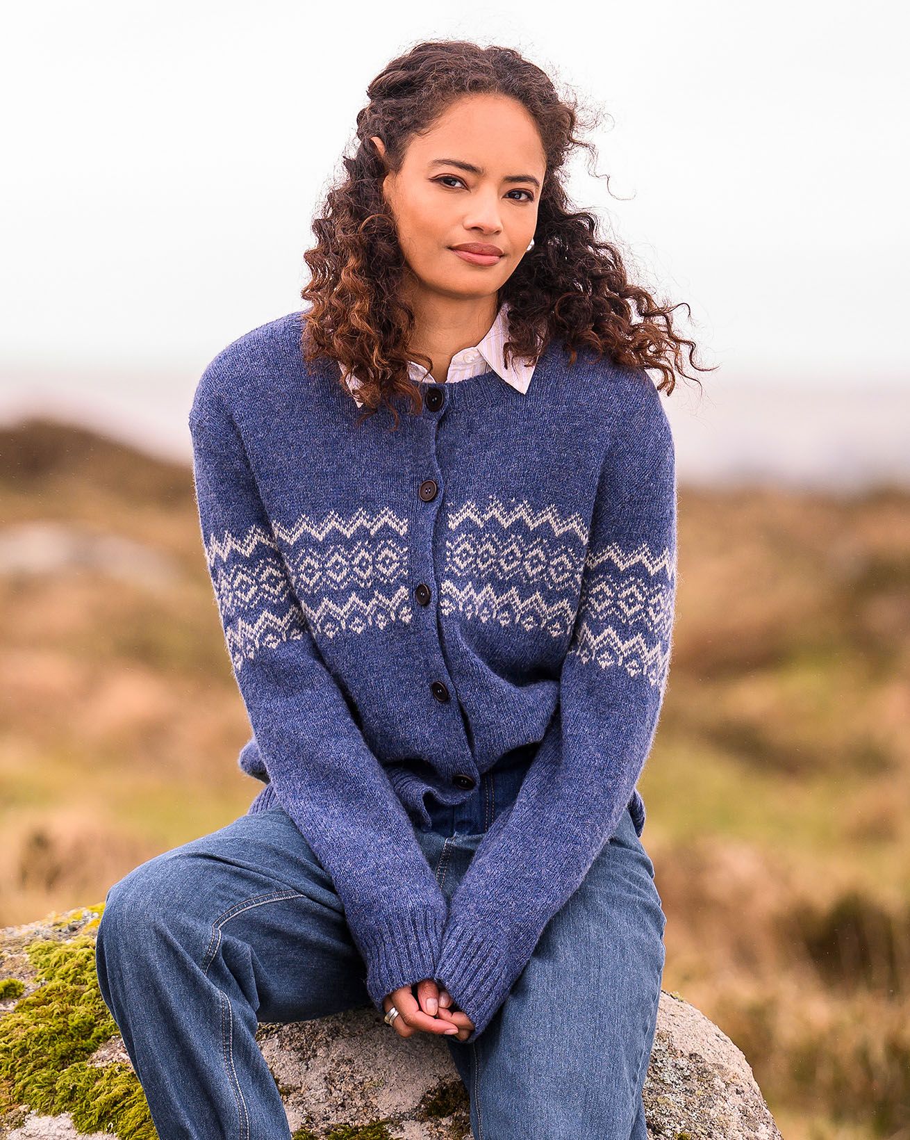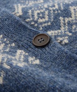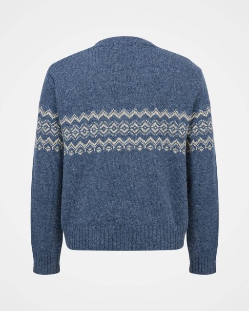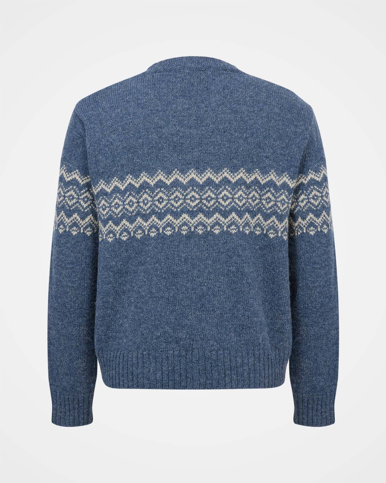 This crew neck cardigan is made from pure new wool, featuring a placement fair isle pattern across the chest and sleeve. This style is finished with Corozo buttons, adding a touch of heritage charm to any outfit.