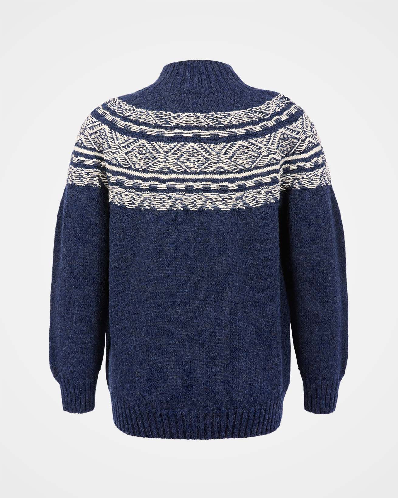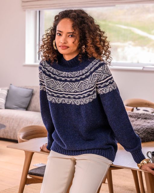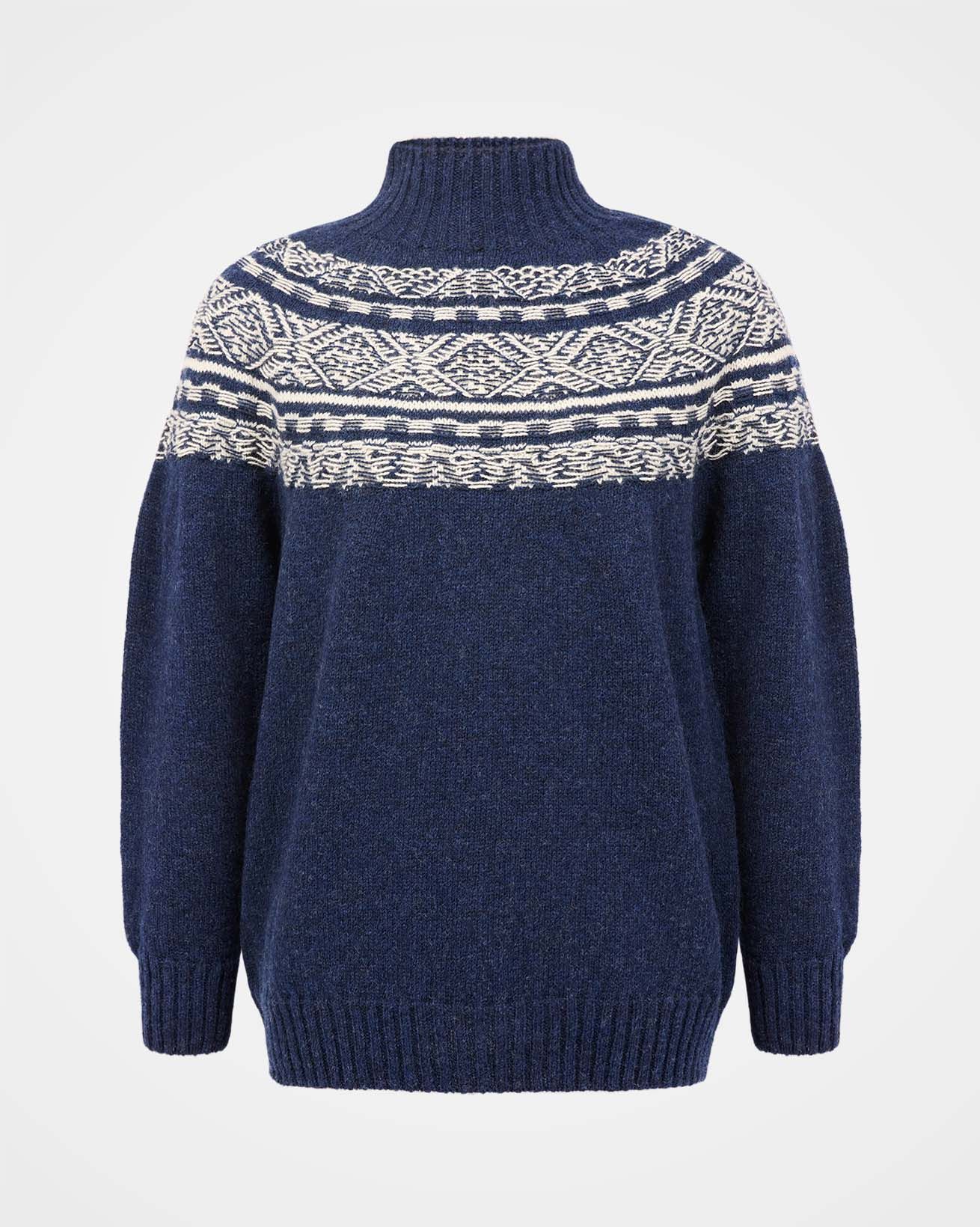 With a classic funnel neckline and seamless construction, this jumper offers a comfortable fit with a touch of British made flair. Its reverse float stitch fair isle pattern on the yoke adds visual interest.