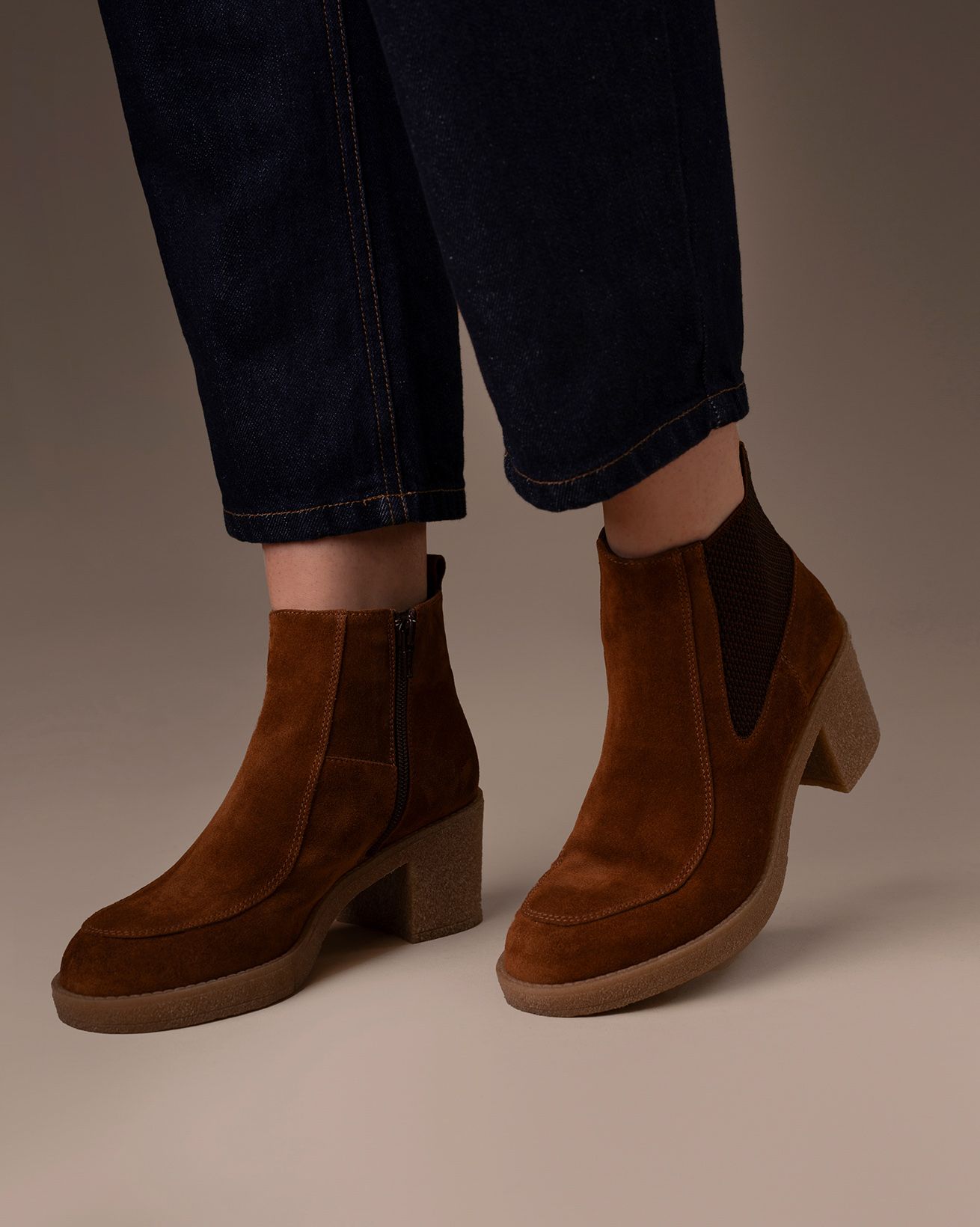 Leather ankle boots featuring an elasticated side panel and seamed toe detail. They are designed with a block heel and a slight platform sole, both made from crepe rubber.