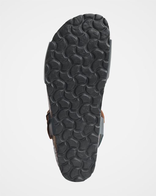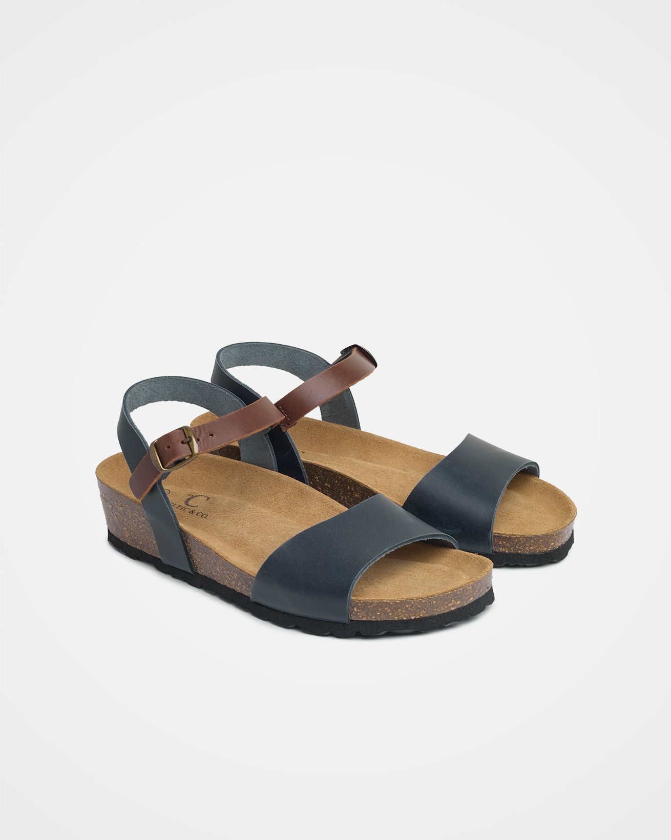 These two-part strap sandals feature a buckled ankle strap and a comfortable low wedge moulded cork sole. With a recycled material outsole, they provide a stylish and considered option for warm-weather outings.
