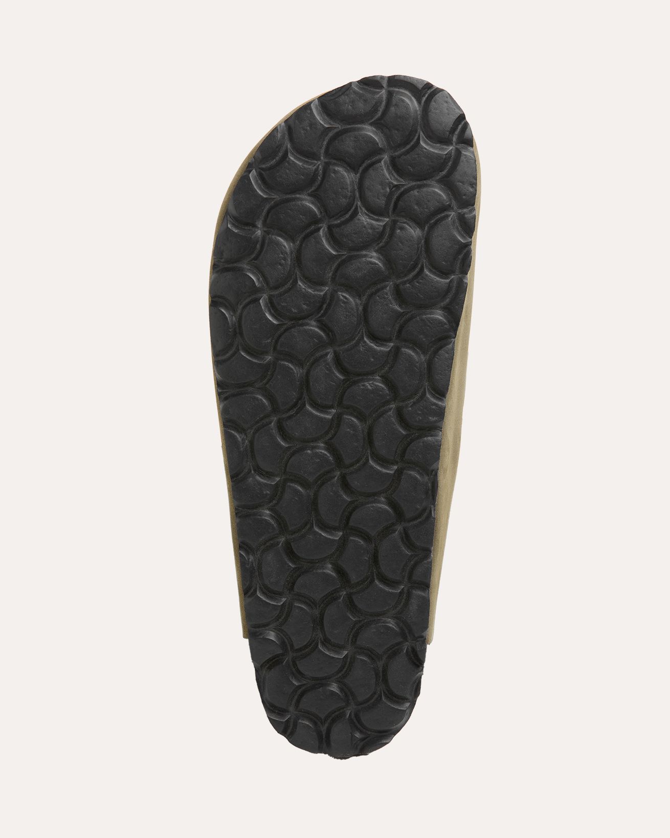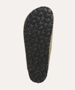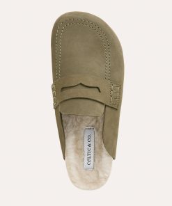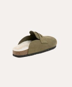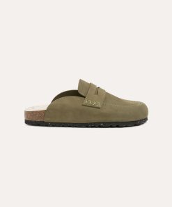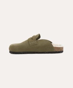 Penny loafer detailed slip-on clogs feature a Cow Nubuck upper. The insole is luxuriously lined with real sheepskin, complemented by a cork midsole and an outsole made from EVA.