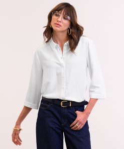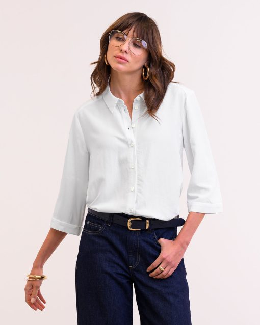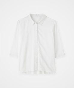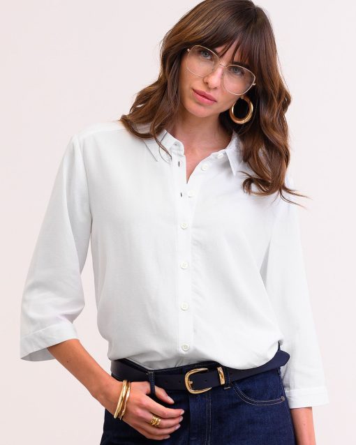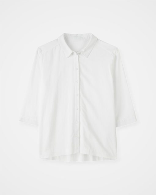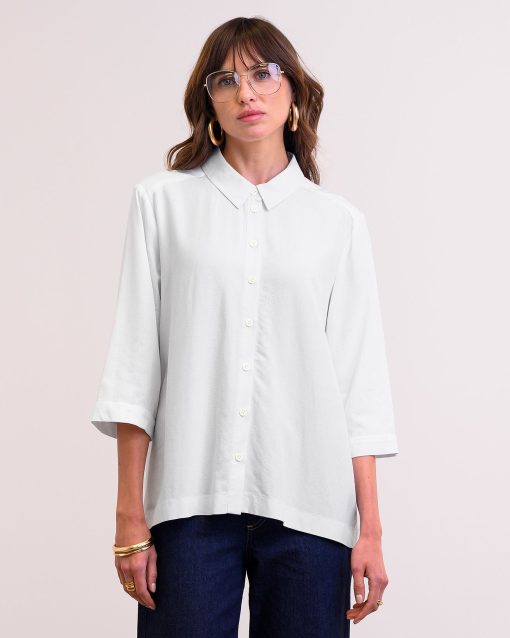 This flattering shirt features a slightly swing shape due to the deep box pleat detail at the back. With a curved hem, which is slightly longer at the back for more coverage, and cropped three-quarter-length sleeves with wide cuffs, the silhouette is clean and modern. The shirt collar, full-length button-through placket, and buttons made from Corozo nut complete the shirt.