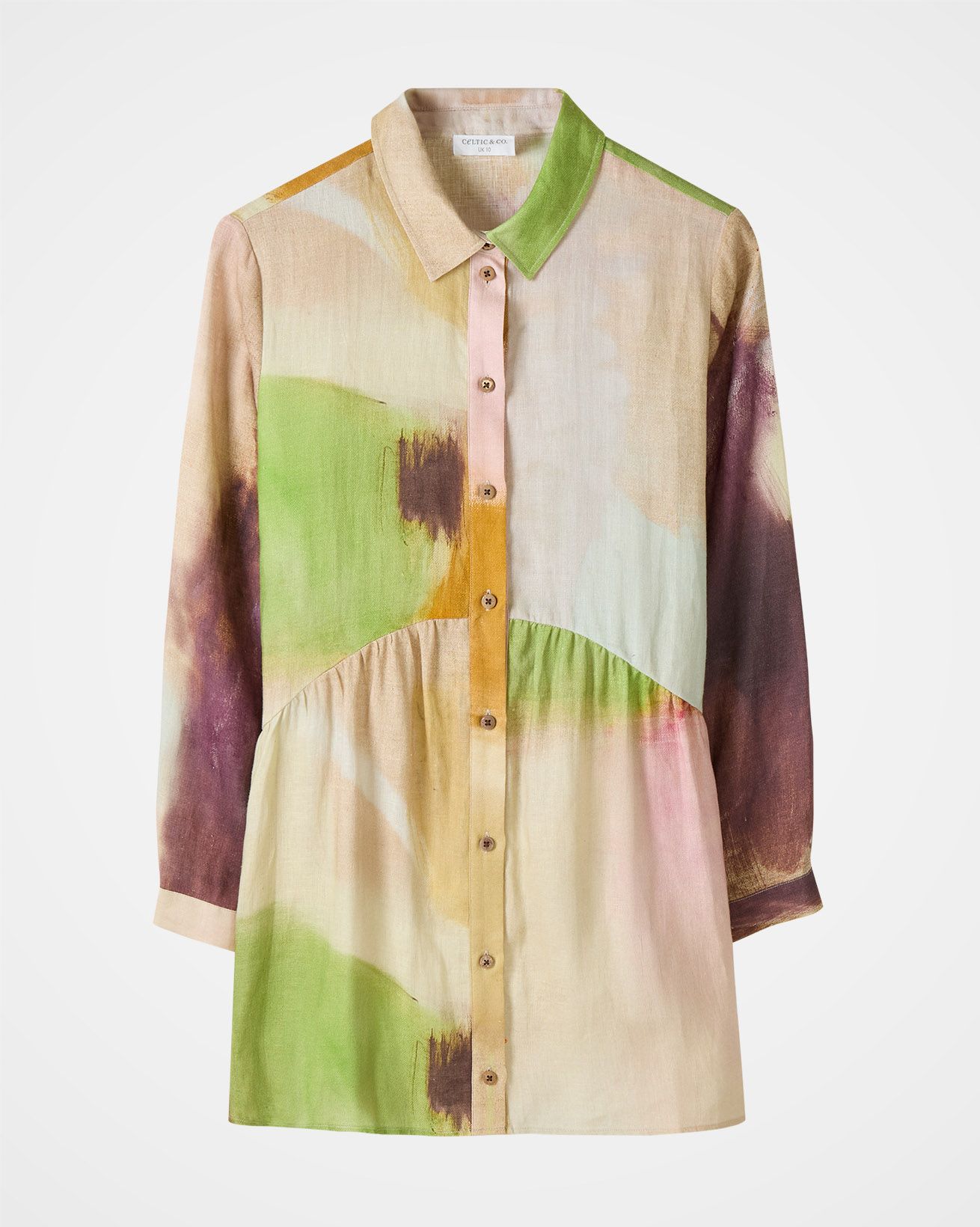 This tunic-length shirt is made from garment-dyed and washed linen, offering a softer, tumbled look. The fit is more oversized, with a curved seam running from the front to the back, creating a fuller gathered peplum around the lower part of the garment. The shirt collar, full-length button-through placket, and full-length shirt sleeves with buttons made from Corozo nut complete the design.