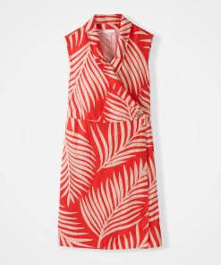 This wrap dress features a shawl collar neckline with adjustable self-ties at the back for a custom fit. Knee-length and sleeveless with practical side-seam pockets, it combines easy style with versatility.