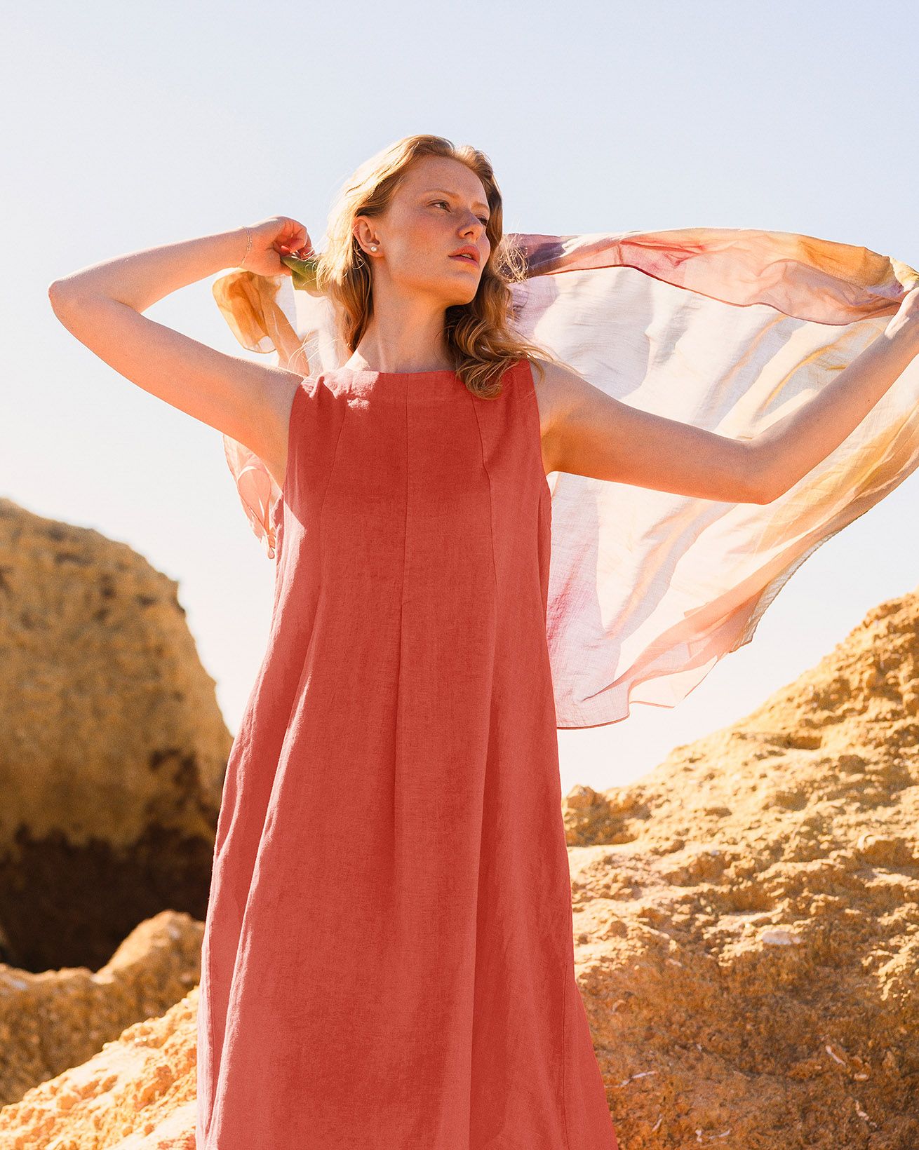 A relaxed midi dress with a round neckline, this piece has a flattering flared silhouette accented by soft pleat details. Finished with a unique coconut button shoulder opening, it’s a light, flowing option for everyday wear.