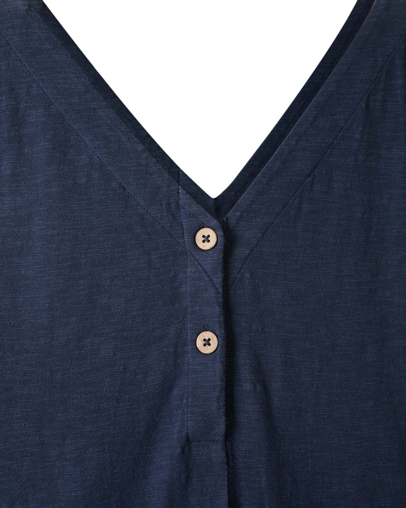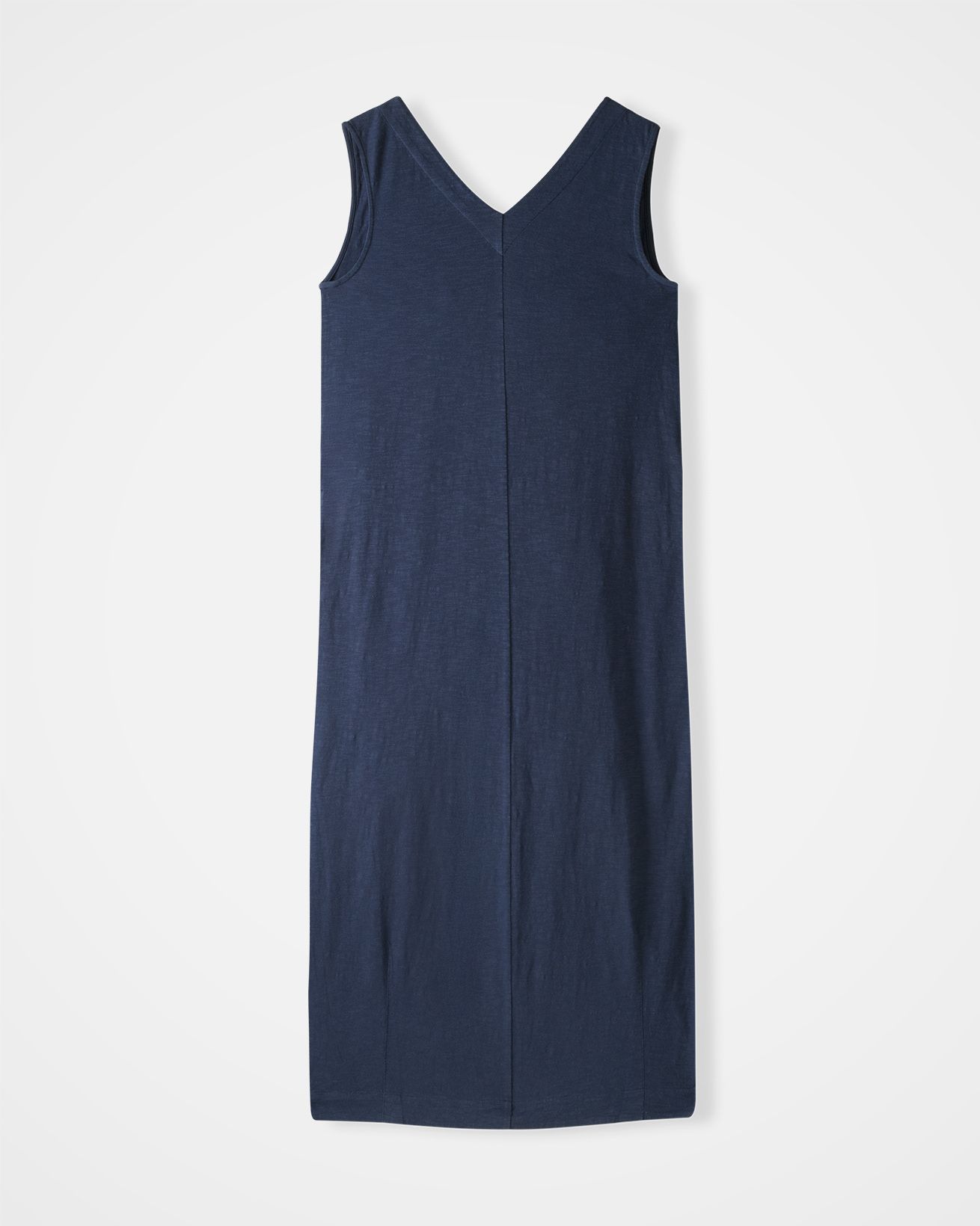 A sleeveless midi with a soft V neckline, this dress has a side seam pocket detail and a back hem split for added movement. The slub texture lends a casual touch, ideal for warm weather layering or simple styling.