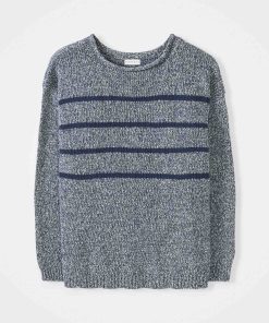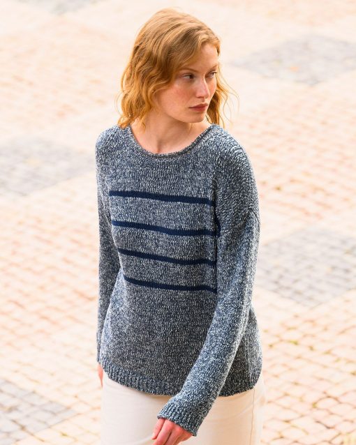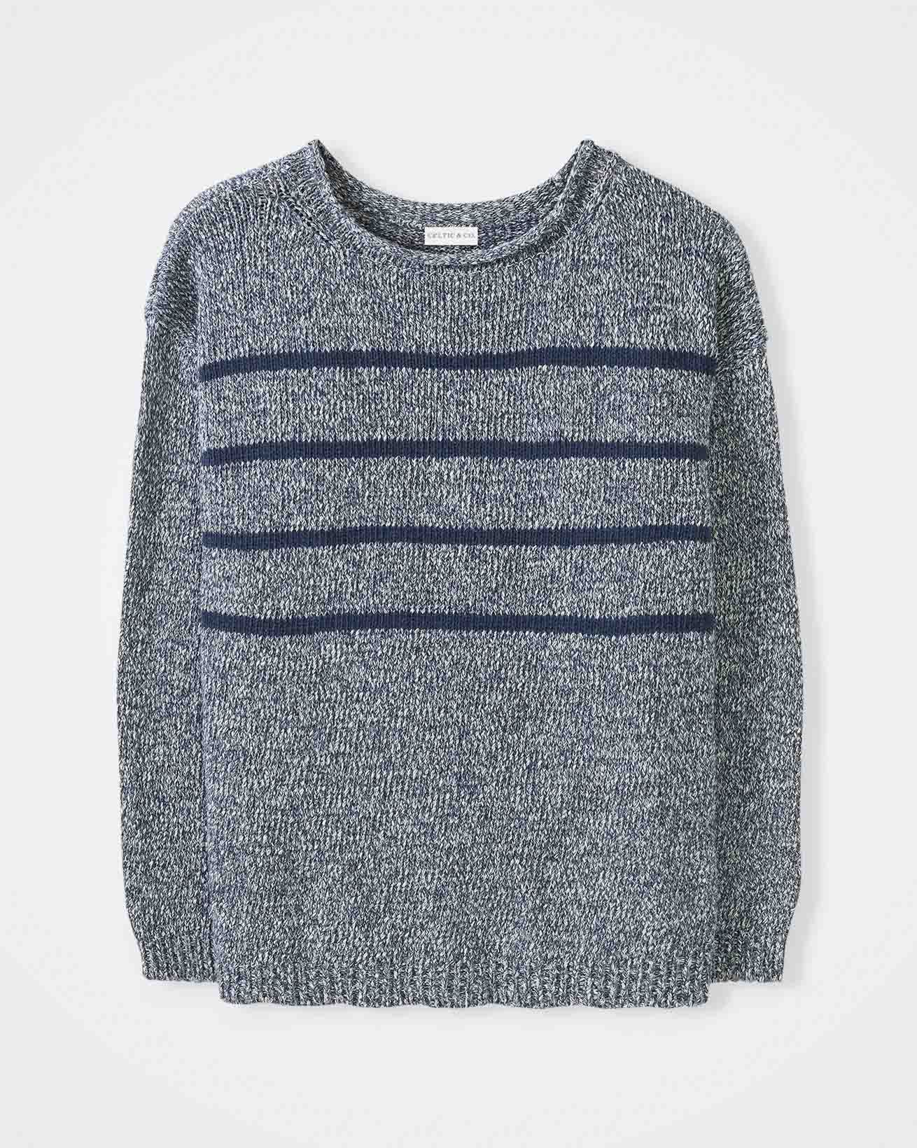 Crafted with a classic boat neckline and rolled edge detail, this Breton-inspired jumper is designed with a relaxed, drop-shoulder fit and finished with ribbed cuffs and hem. The yarn twist adds depth and texture, perfect for layering or wearing on its own.