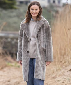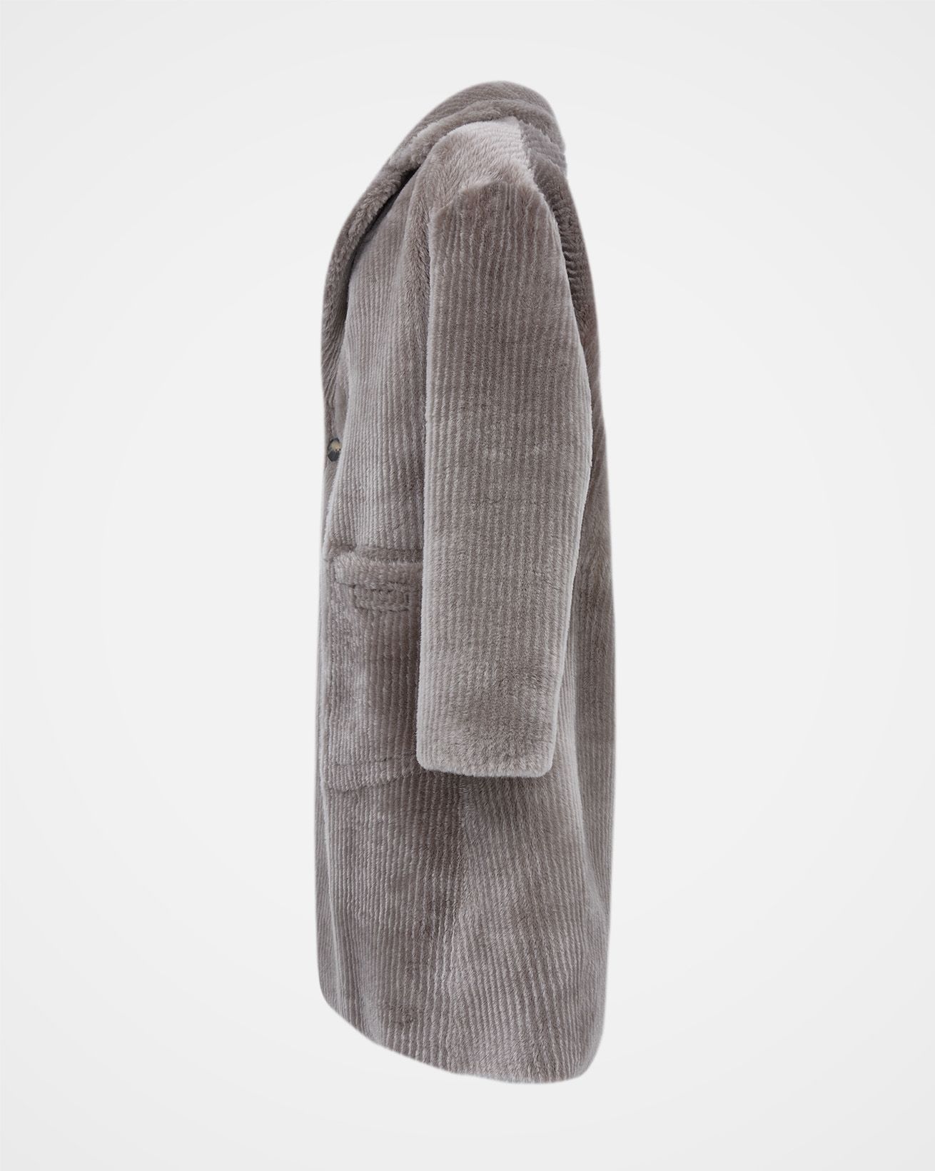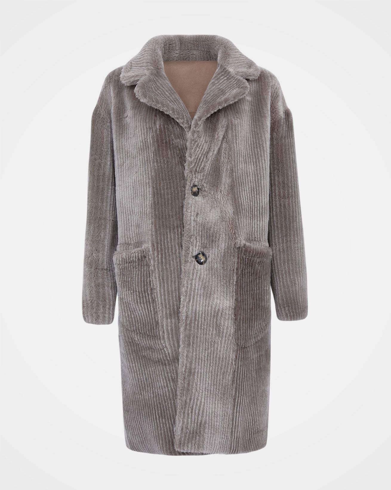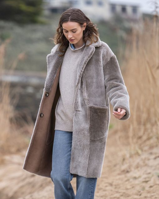 Warm, luxurious and versatile. Our corded sheepskin coat can be worn with the nappa side out for a more casual look, or reversed to wear the luxe side out, showing off the corded finish of the wool. Whichever way you choose, the collar and revere exhibits the soft wool. Nappa side out exposes the wool on the turn-back cuffs, and when worn the opposite way sizing increases by half a size to allow for layering of chunkier knitwear. Details include horn buttons at the front and patch pockets at hip level.