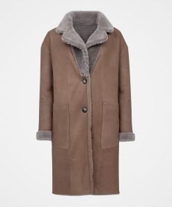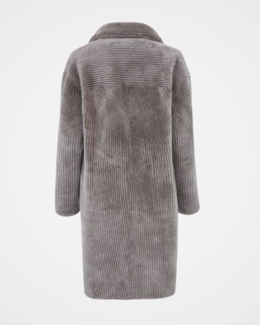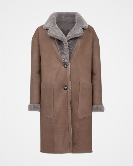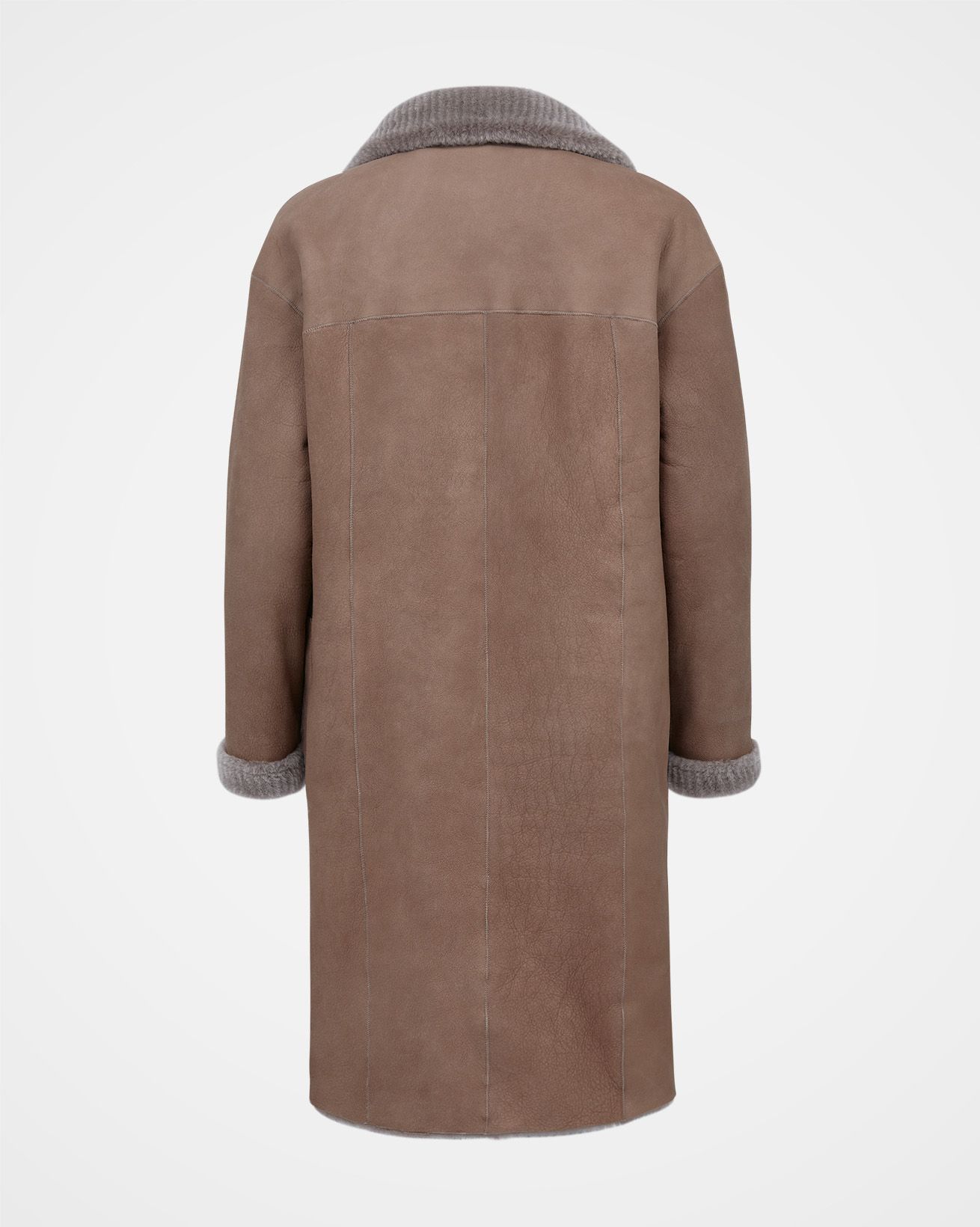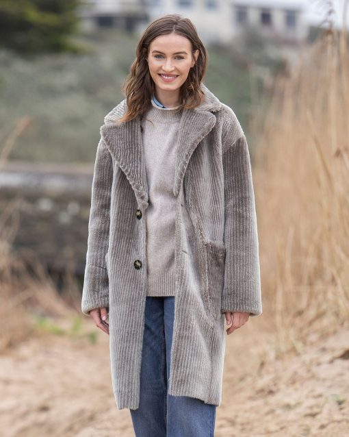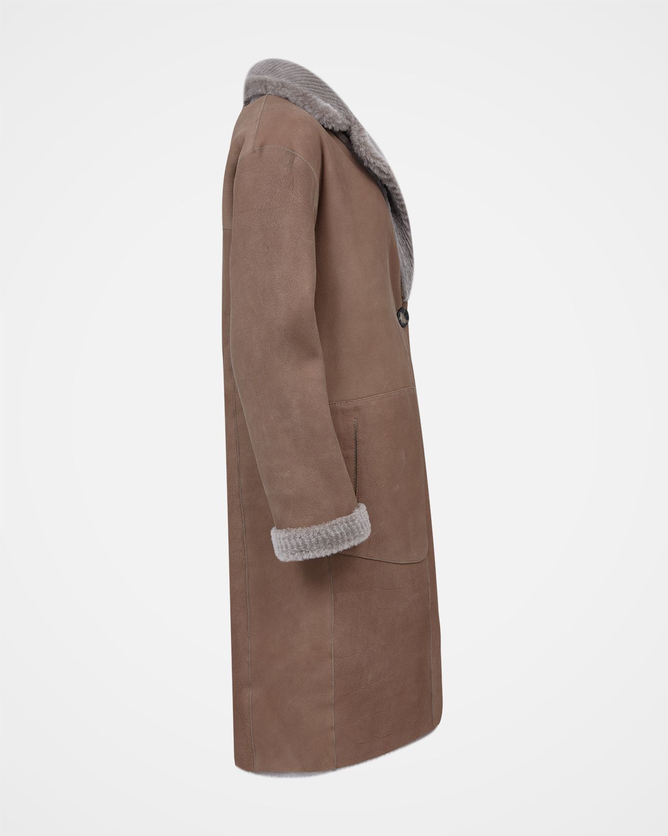 Warm, luxurious and versatile. Our corded sheepskin coat can be worn with the nappa side out for a more casual look, or reversed to wear the luxe side out, showing off the corded finish of the wool. Whichever way you choose, the collar and revere exhibits the soft wool. Nappa side out exposes the wool on the turn-back cuffs, and when worn the opposite way sizing increases by half a size to allow for layering of chunkier knitwear. Details include horn buttons at the front and patch pockets at hip level.