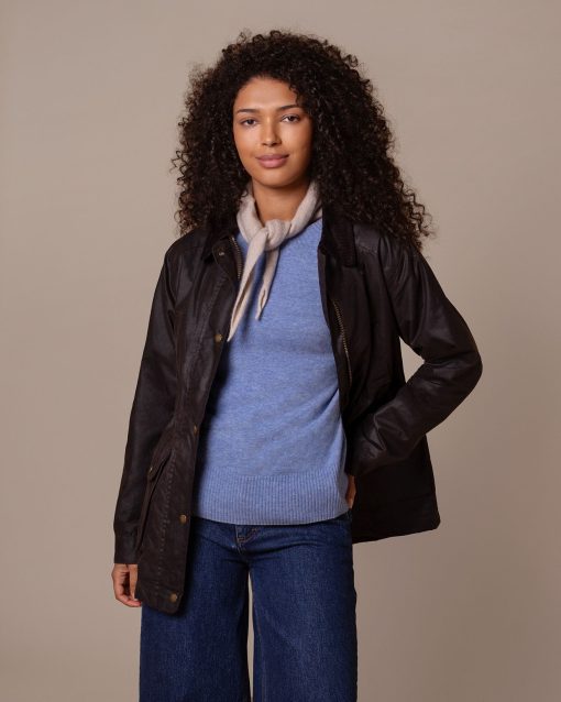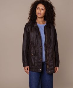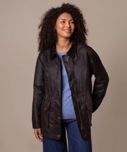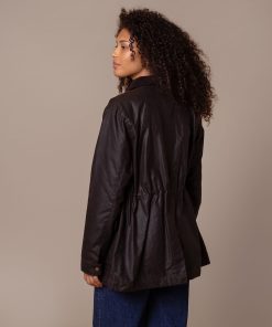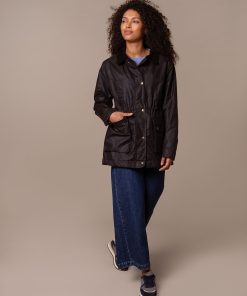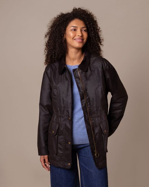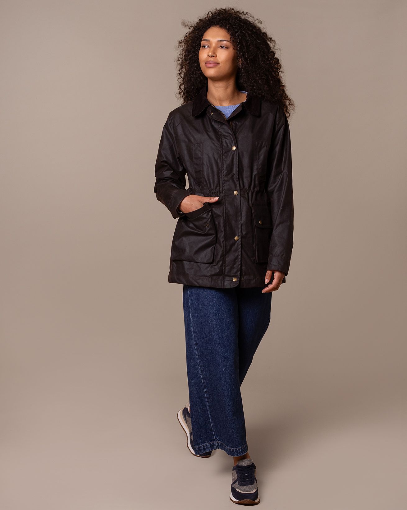 Made in Britain, the hip-length Waxed Cotton Zip Through Jacket features a stylish corduroy collar and an internal drawstring waist detail for a customized fit.
