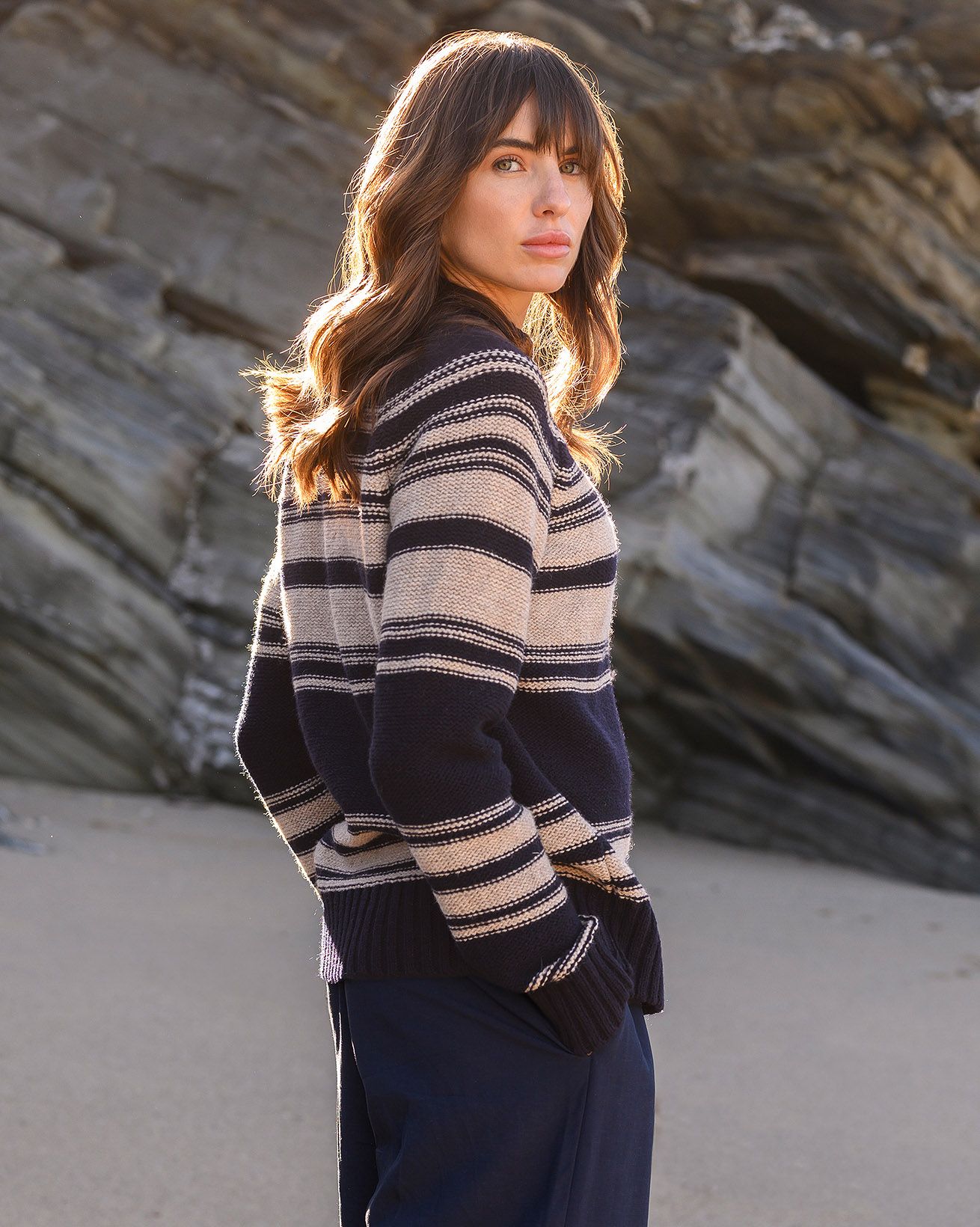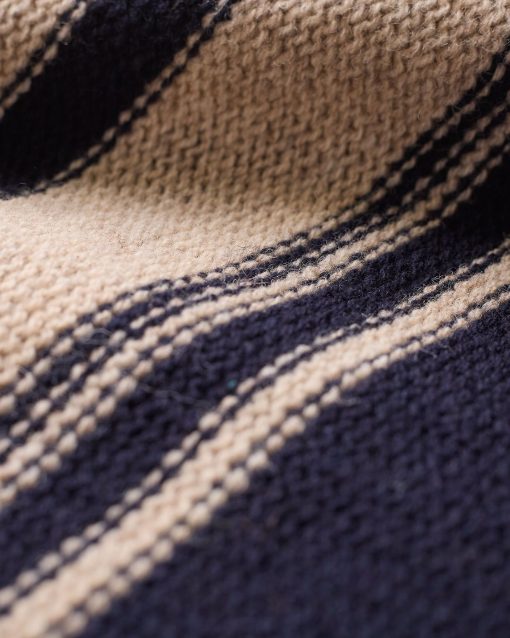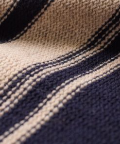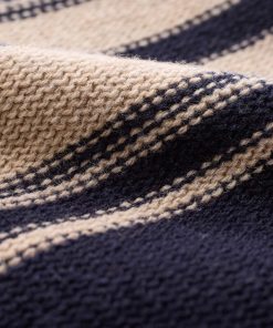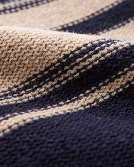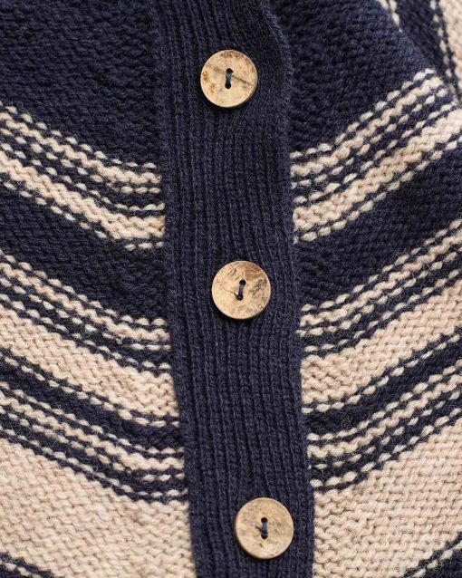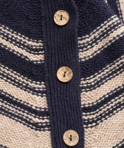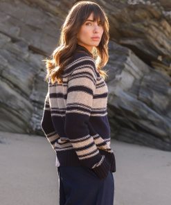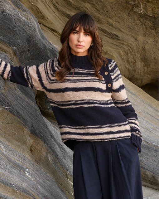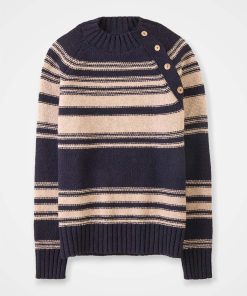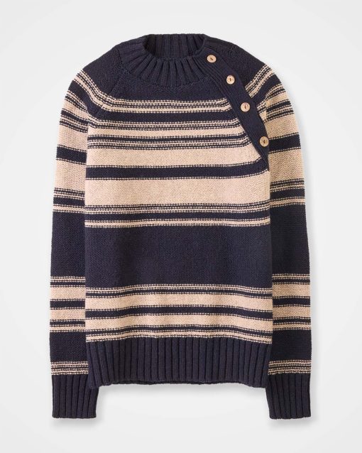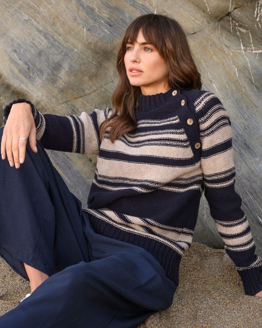 Celtic & Co Women’s Purl Stitch Stripe Button Neck Jumper | Dark Navy & Oatmeal