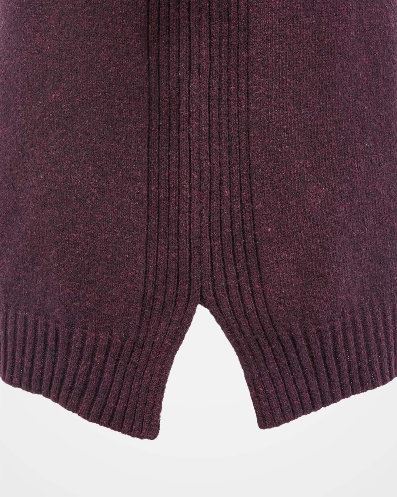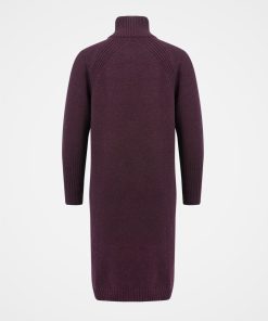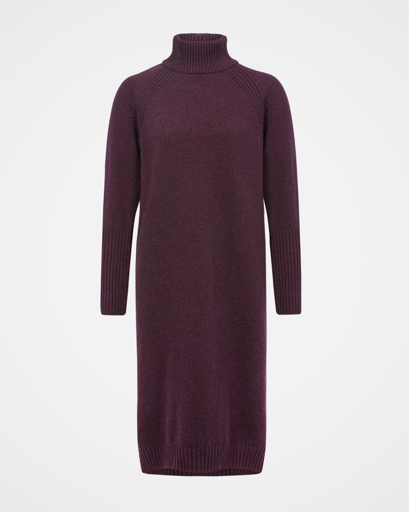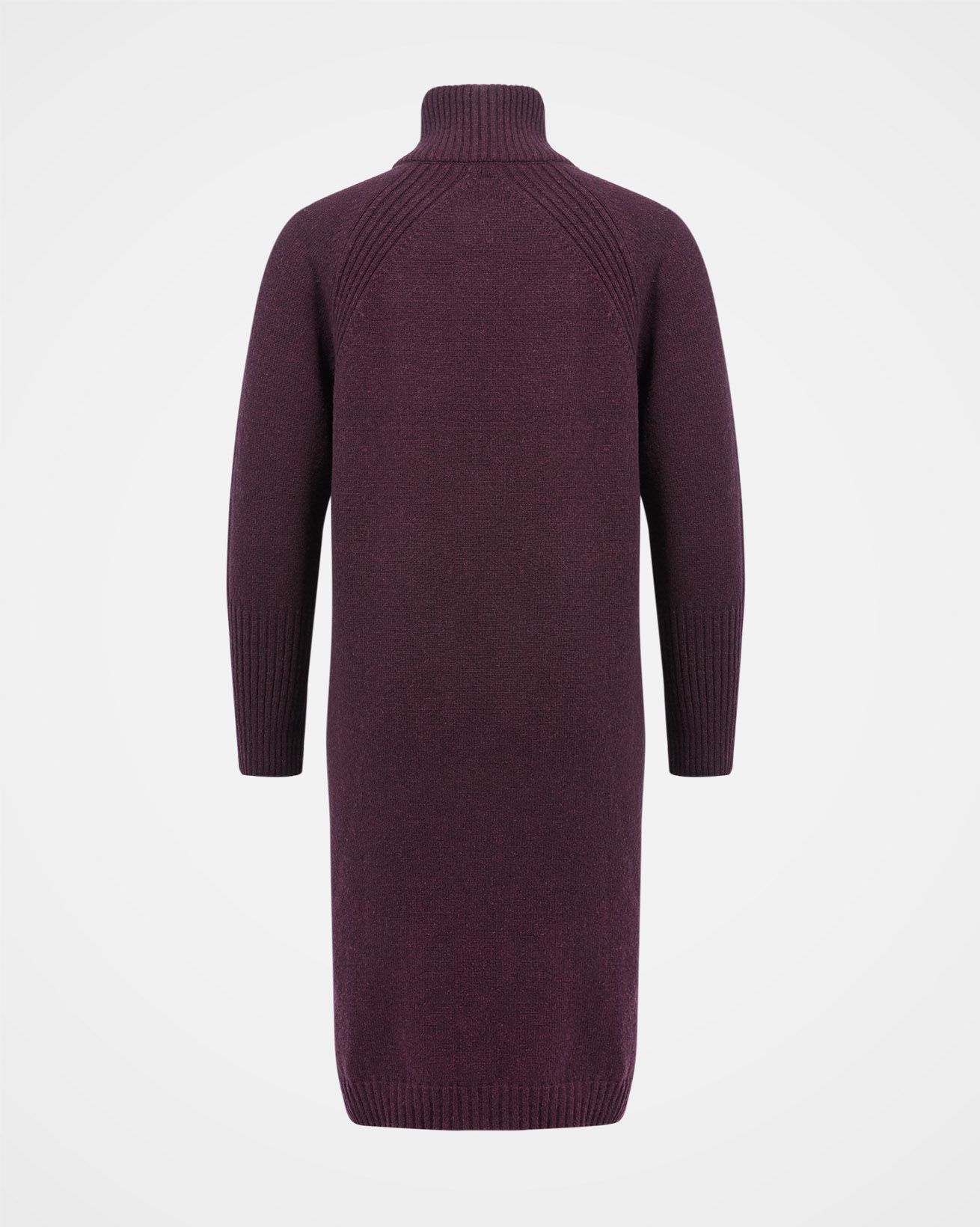 A knee-length dress featuring a funnel neckline and mid-weight knit. It boasts ribbed collar, cuffs, hem, and ribbed raglan detail, offering comfort and style for any occasion.