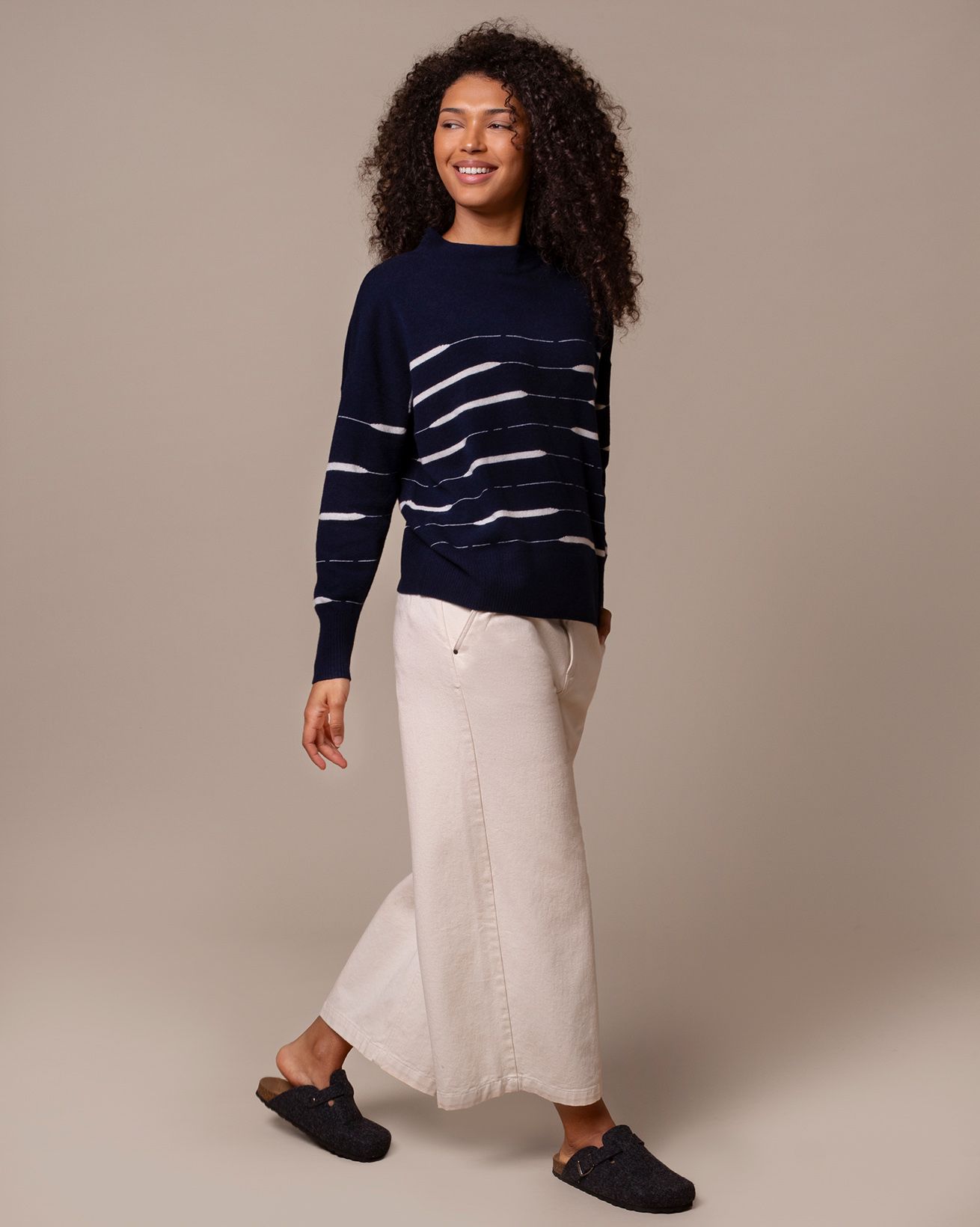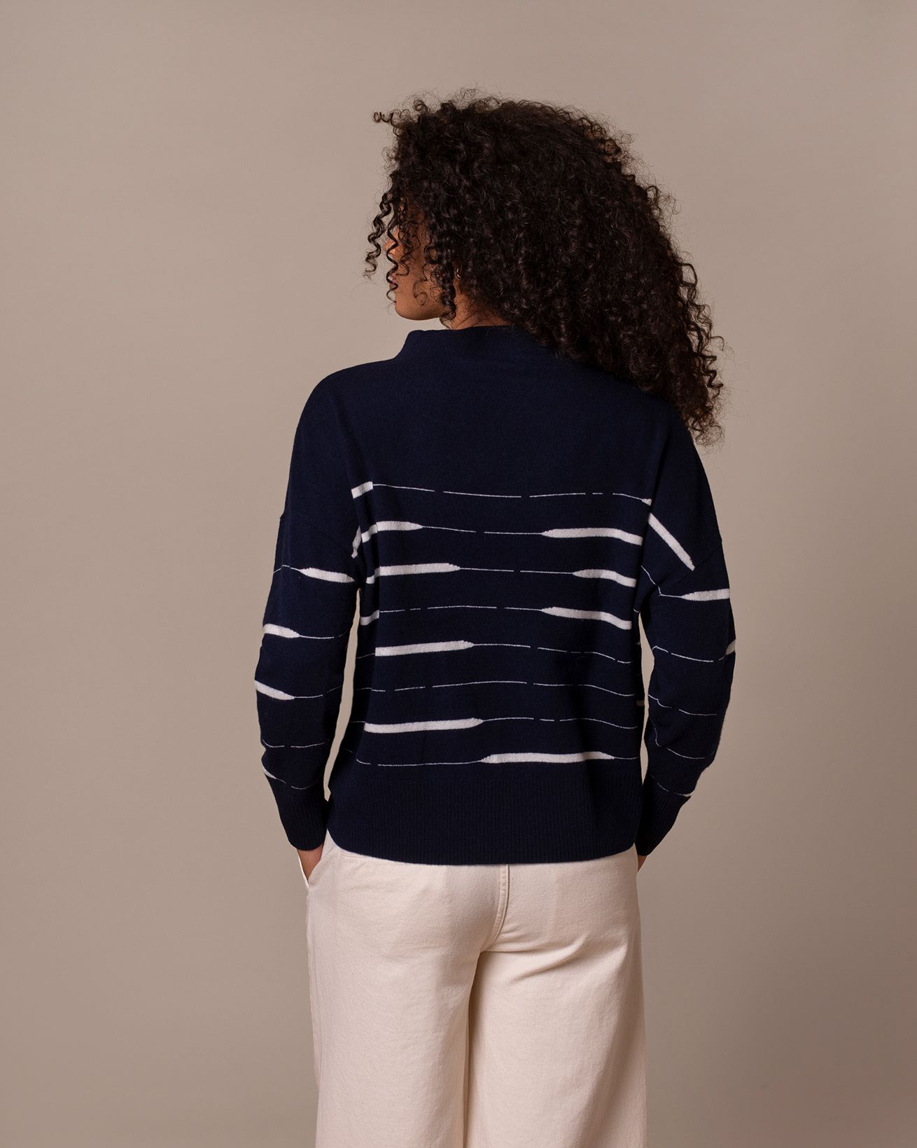 Made from pure lambswool, this jumper offers a slouchy fit with dropped shoulders and a grown-on funnel neck for a relaxed silhouette. An irregular stripe adds a modern twist to a classic Breton style. Finished with ribbed cuffs and hem for shape and comfort.